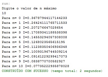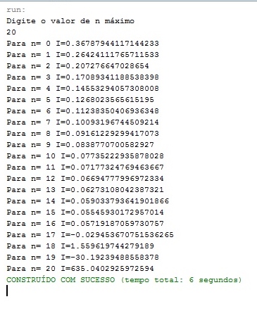 Nesse exercício, há também um erro de truncamento que se propaga desde a primeira operação realizada pelo algoritmo, quando ele calculo o I0. Isso porque o I0 tem o e (Número de Euler), e como esse é um número irracional, o computador não representa todas as casas decimais e truncando-o, propagando para todos então esse erro.