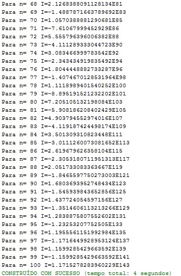 Para um maior valor de n, n=20, percebe-se que até n=16, L apresenta um comportamento regular, os números vão ficando cada vez menores e vão convergindo para zero; porém a partir de n=17, o módulo dos valores de L começam a aumentar, alternando- se o sinal. E como pode ser visto nas imagens a seguir, os valores de L continuam aumentando e o padrão de alteração de sinal se mantém.