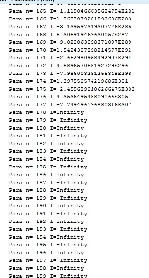 Agora analisando o resultado de L quando n=177 (o último representado) percebe-se que a ordem de grandeza desse número é muito próxima ao maior número que o computador consegue representar, dessa maneira podemos concluir que quando n=178, o computador não consegue imprimir o resultado pois ele é maior que o maior número que a máquina consegue representar. É possível concluir também que a impressão de infinito ocorre quando o valor ultrapassa o valor máximo representado pelo computador.