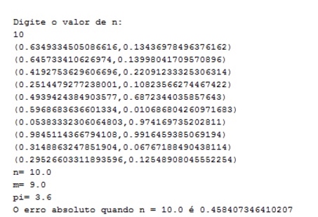 Nesse código, além de gerar uma sucessão de pares aleatórios e dessa maneira, valores diferentes de pi, também é possível calcular o erro absoluto. O cálculo desse último corresponde ao módulo da subtração do valor de pi usado pelo java do valor obtido no algoritmo.