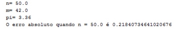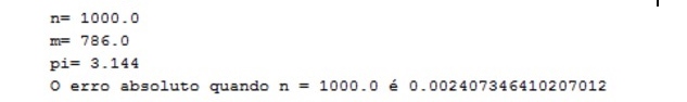 Com eles foi possível perceber que o erro absoluto diminui com o aumento de valor de n, isso ocorre porque quando o número de pares escolhidos pelo usuário é grande, ele é capaz de gerar mais pares m dentro da região delimitada, aumentando a precisão da divisão e, dessa maneira, diminuindo a diferença entre o pi obtido pela expressão e o pi representado pelo java (que é 3.1415926535897932).