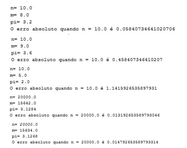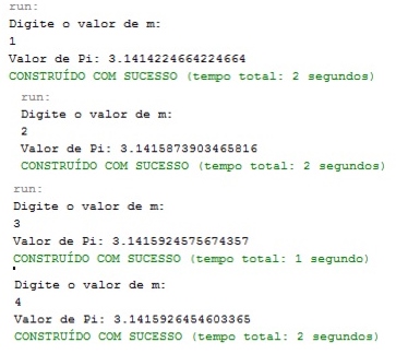Como visto nas imagens a cima, quando m>=10, obtém-se uma aproximação que coincide com a mesmo valor de π que o java usa.