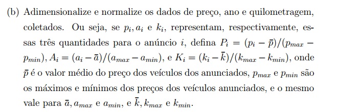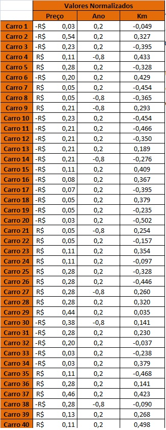 Após localizarmos os valores máximos e mínimos para preço, ano e quilometragem, calculamos Pi, Ai e Ki no excel e obtivemos os seguintes valores