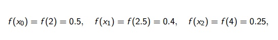 Associar f(x)=(1/x) por P(x) nos pontos x0=2, xi=2,5 e x2=4