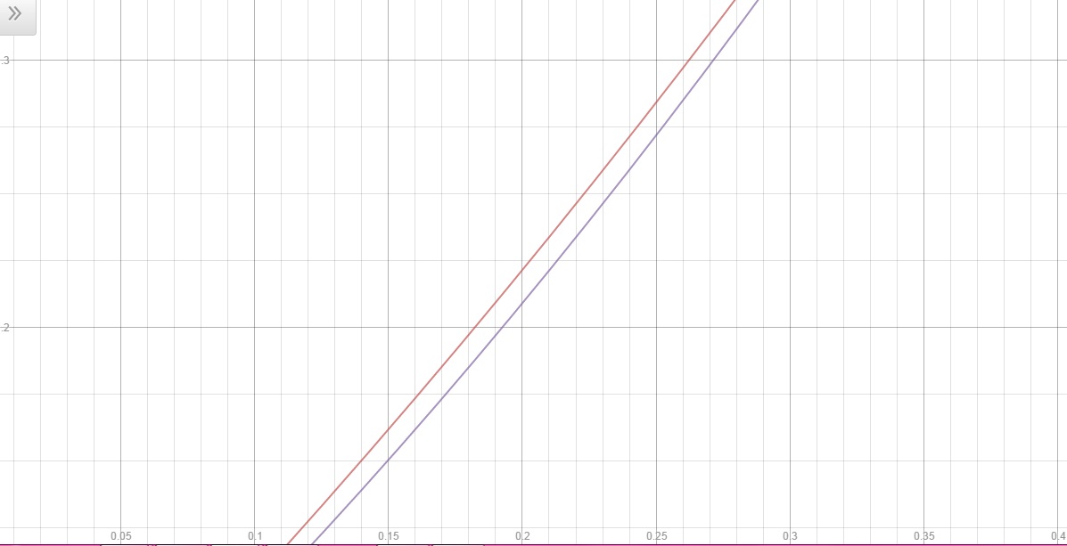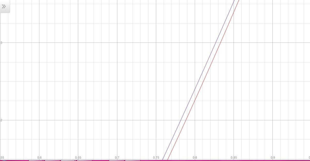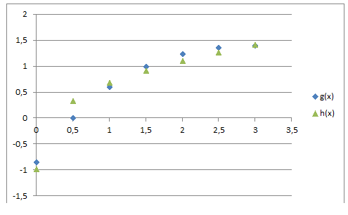 Vamos igualar as funções para descobrir o valor aproximado do ponto de interseção x':