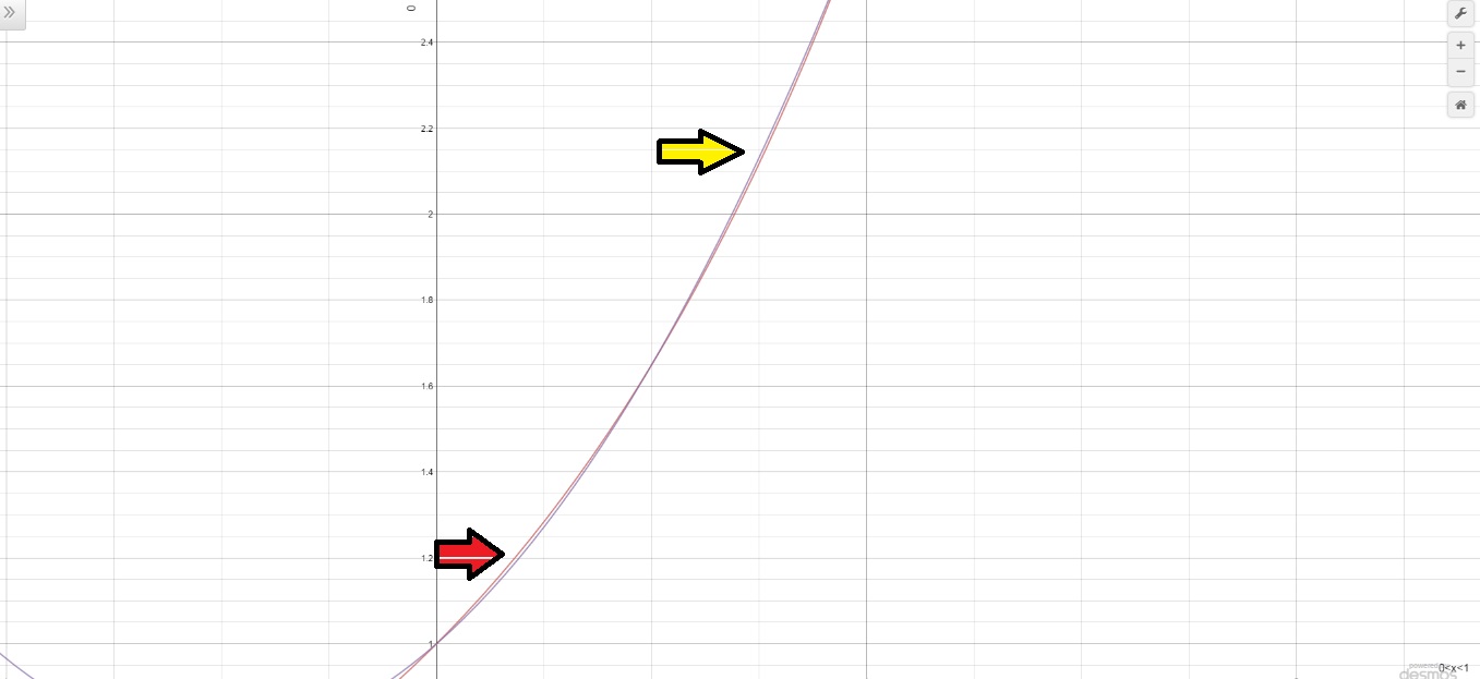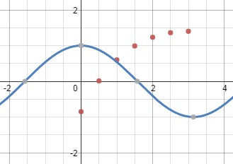 Com essa última imagem, ficou um pouco mais fácil saber qual foi o pior intervalo, então podemos concluir que o ponto com pior arpoximação está no intervalo de [0,0.4]. E aparentemento esse ponto é 0,25. No Segundo intervalo considerado [0.55, 1] tem-se uma ruim aproximação em 0,75 mais ou menos. Agora comparando as aproximações em 0,25 e 0,75 não é possível concluir qual deles é a pior.