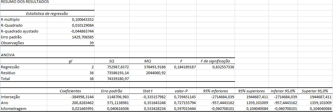 Após escolhido essa função, selecionamos os respectivos valores Y para o preço, e X para quilometragem e ano. Após isso, selecionamos nova planilha e o restultado obtido foi: