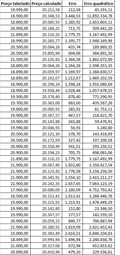 Em seguida, esses erros foram elevados ao quadrado. Todos os valores foram colocados na tabela abaixo: