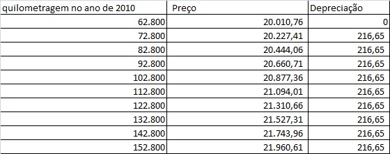 Portanto a depreciação para cada 10000km rodados é de R$216,65 e a depreciação anual para o valor do carro é de R$200,82.
