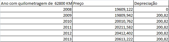 Bem como a da quilometragem, a depreciação anual também é a mesma, se mantém constante para todos os anos calculados .