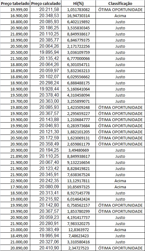 Utilizando o Excel, para cada valor de kilometragem e ano, foram calculados os preços a partir da equação de P encontrada no item anterior: